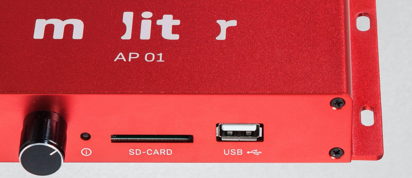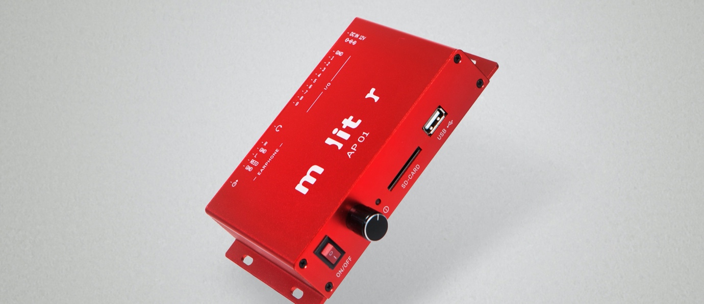 Аудиоплеер AP01 был специально разработан для использования на выставках, экспозициях и на торговых или информационных точках. Все в этом плейере призвано и исполнено для постоянного использования. Наушники, кнопки и датчики можно легко подключить с помощью удобной для подключения панели управления. В дополнение к стандартному списку воспроизведения, в случае сложных требований к сценариям могут быть реализованы настраиваемые списки воспроизведения. Кнопки и датчики интегрированы в программирование с девятью свободно назначаемыми входами для сложных приложений. Аудиоданные могут быть сохранены на карте памяти SDHC или через USB-накопитель. Встроенный усилитель позволяет подключить до двух трубок или наушников. Можно подключить внешние усилители или активные динамики с помощью разъема линейного выхода.
