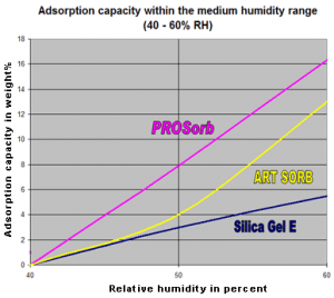 Идеальный уровень влажности для большинства музейных витрин и шкафов для хранения – это уровень относительной влажности от 40 до 60%. Также очень важно поддерживать этот уровень продолжительный промежуток времени. PROSorb обладает уникальной и исключительной адсорбционной способностью в диапазоне относительной влажности 40 — 60% (см. График) и превосходит все другие альтернативные продукты, продаваемые для этой цели.